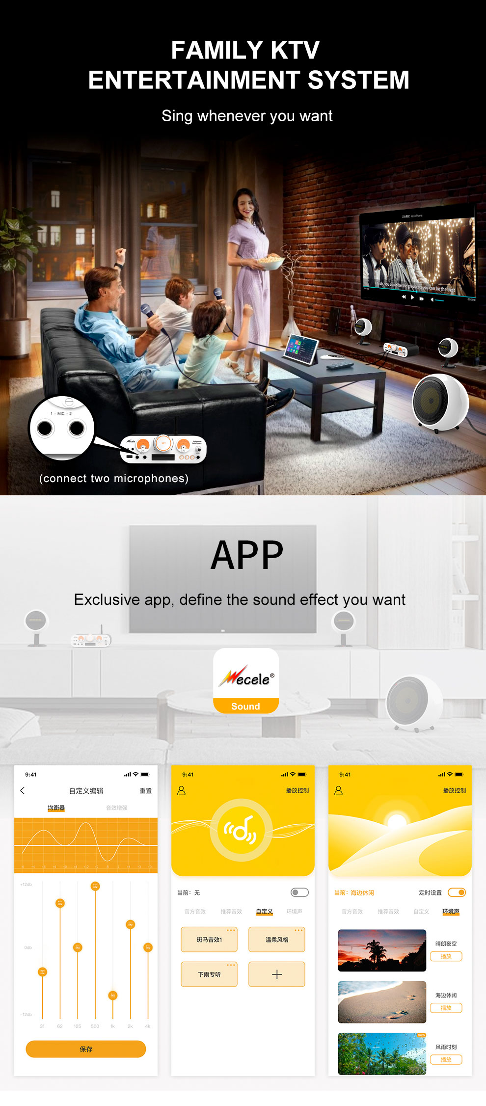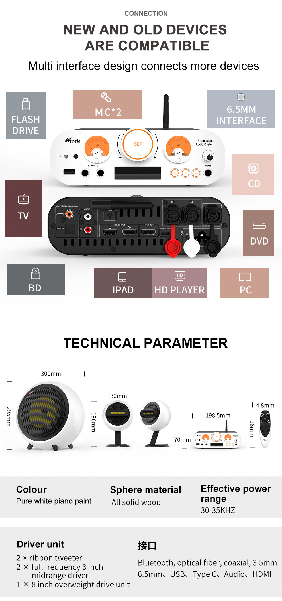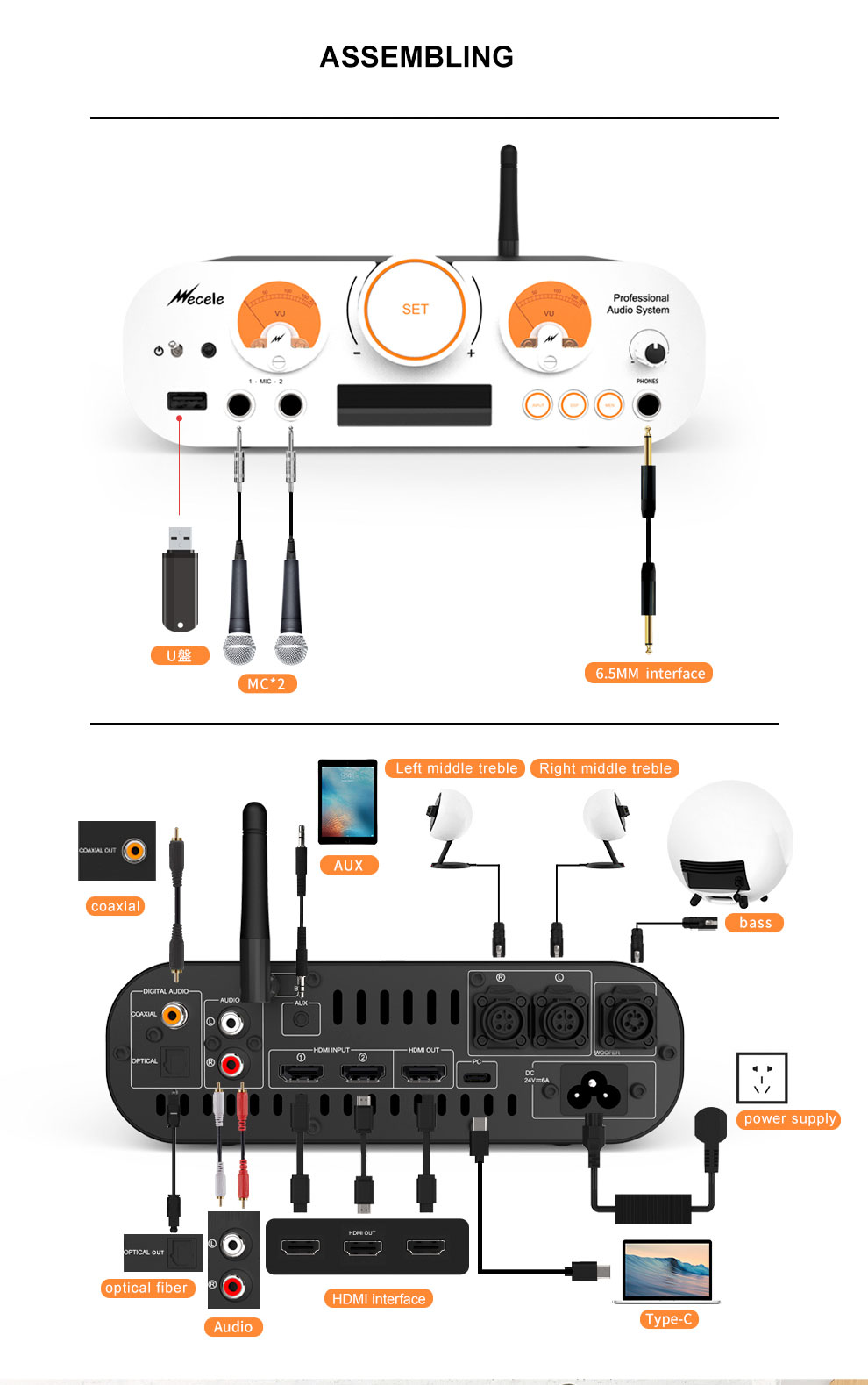 Interface:Bluetooth, optical fiber, coaxial、3.5mm、6.5mm、USB、Type C、Audio、HDMI